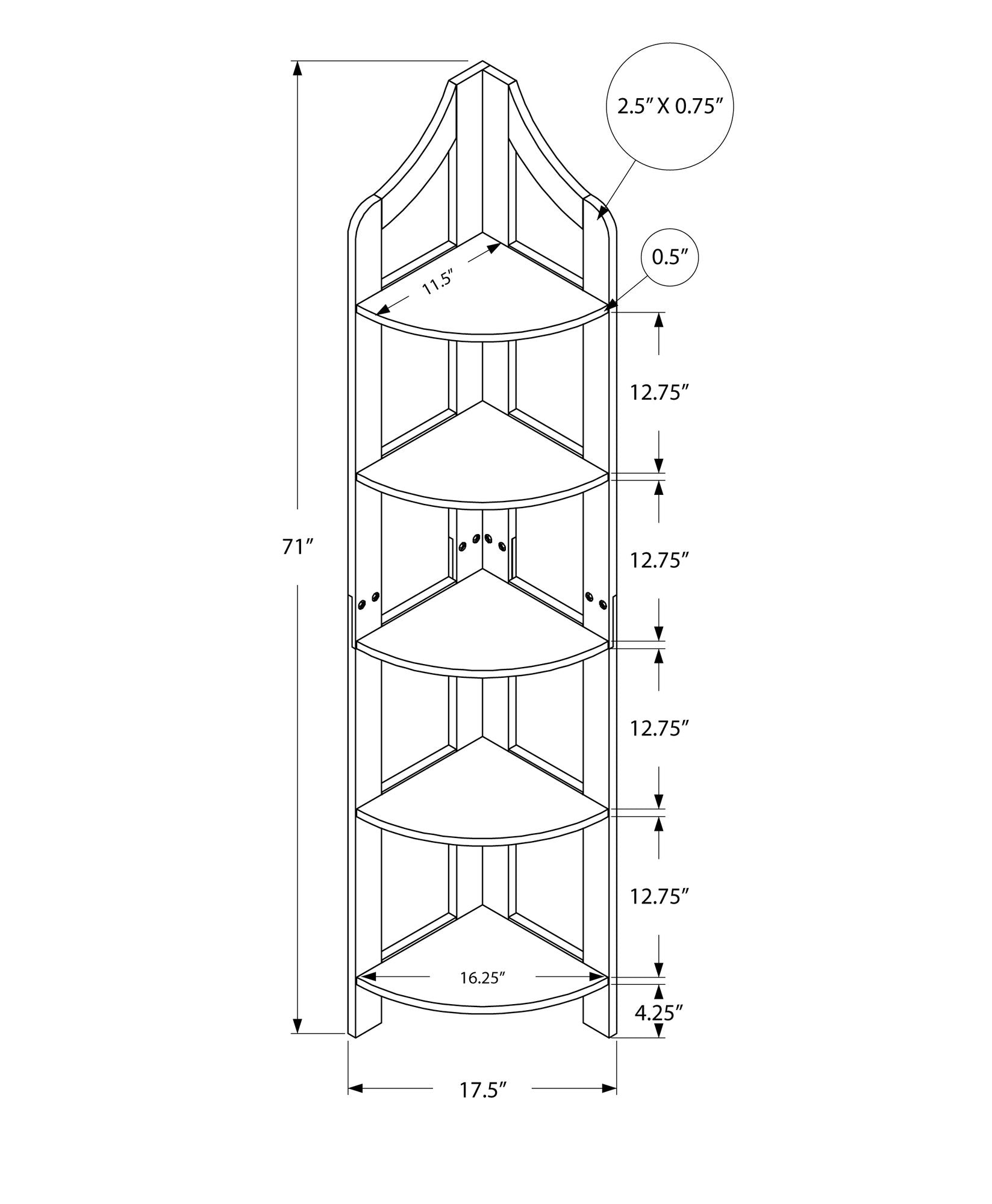 Fill that empty corner space in your hallway, living room, or bedroom with this elegant corner style shelf/bookcase. Offering plenty of storage space with 5 fixed wedge style shelves to place books, pictures, plants, or showcase your decorative objects.