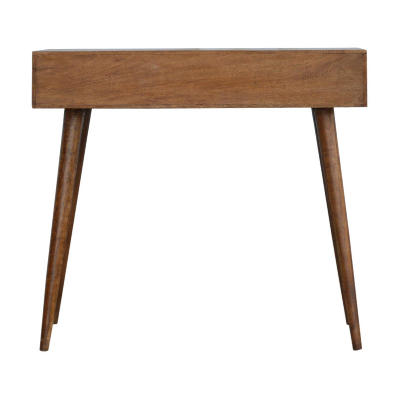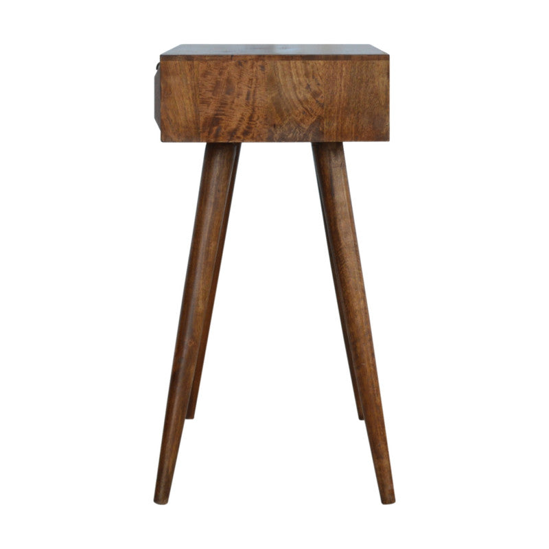 Chestnut Prism Console Table. This solid wood console table has been constructed from 100% solid mango wood and finished in a chestnut finish. It provides ample space on top for any lamps, plants, or photo frames. The main feature of this piece is the hand-carved, raised prism design on the drawer front. It also includes one plain drawer which can be used for storing any small items. It is the perfect piece for the hallway and will fit nicely into your home, with its clean design to suit most interiors.