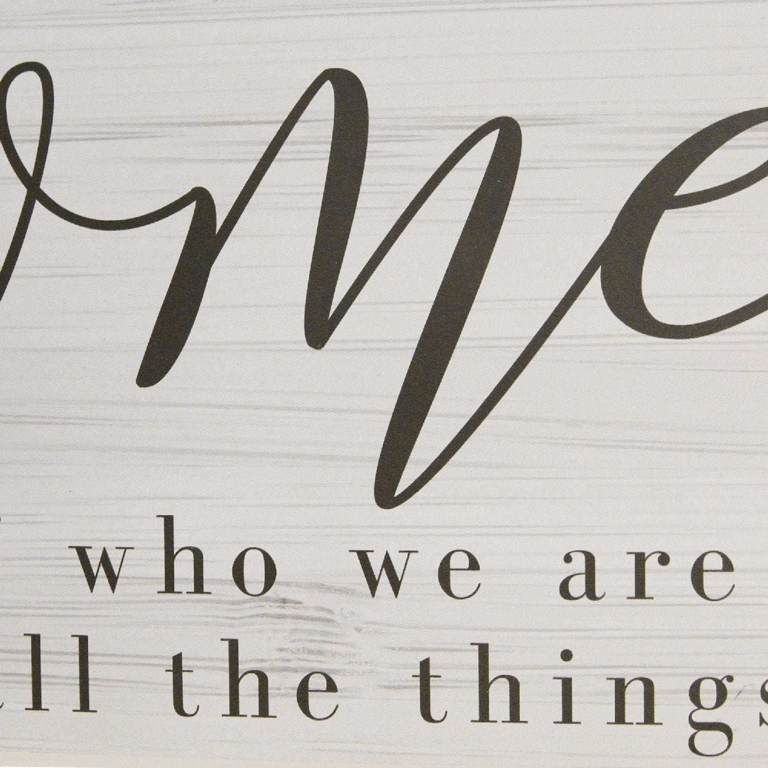 Show your sentimental side in any room of your home with the "Home" Quote Oversized Wall Art. This frameless wall art is handcrafted in a simplistic design letting the saying "Home" "The story of who we are and a collection of all the things we love" be the main focal point. The quote is creatively printed on faded grain white paper on board in a fun mix of font styles. The heartfelt aesthetic is sure to be appreciated and admired wherever displayed.